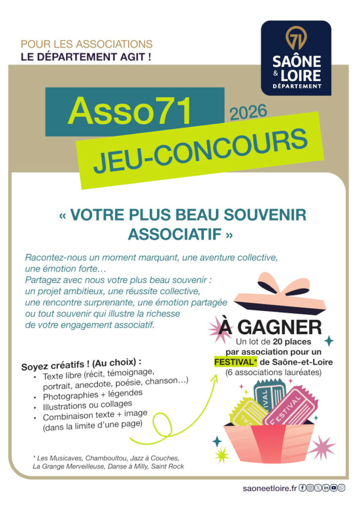 Vous trouverez en pièces jointes la présentation du concours et le formulaire d’inscription. Les candidatures sont à envoyer par mail à asso71@saoneetloire71.fr ou par courrier postal : Asso71 – Direction des sports et de la vie associative – Département de Saône‑et‑Loire – 389 avenue Maréchal de Lattre de Tassigny – 71000 Mâcon
